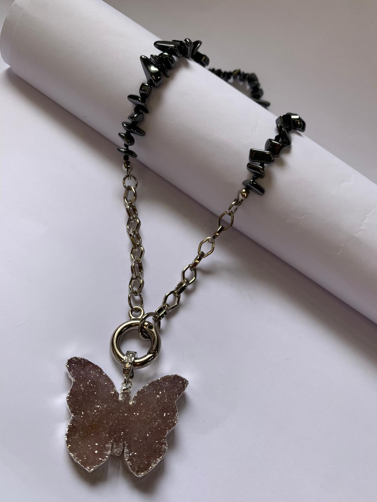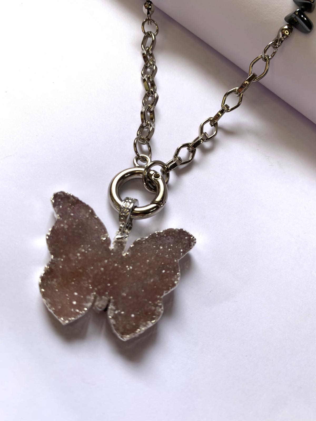 Conjunto en hematite: collar con dije mariposa en druzy, pulsera y caravanas