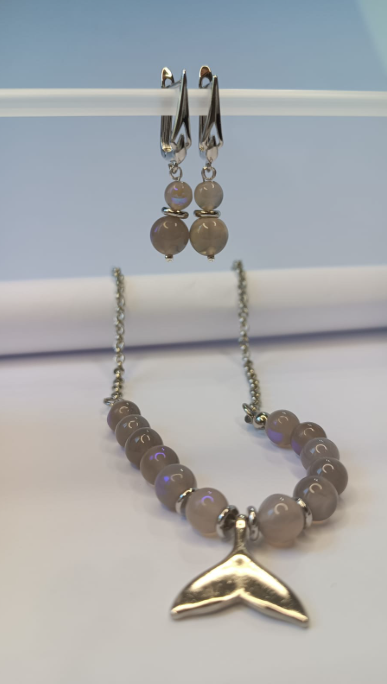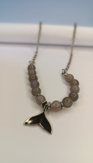 Collar en piedra labradorita , dije en forma de cola de pez y cadena en acero laqueado