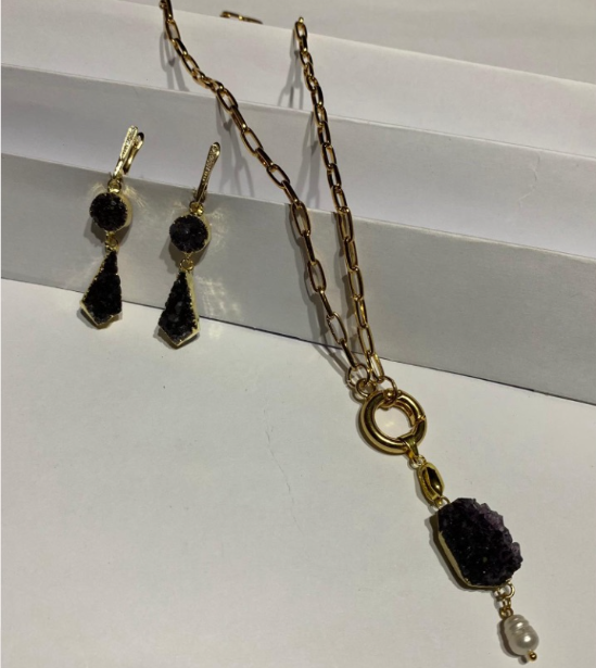 Baño en oro, amatista y perla de rĂo: Collar y Caravanas