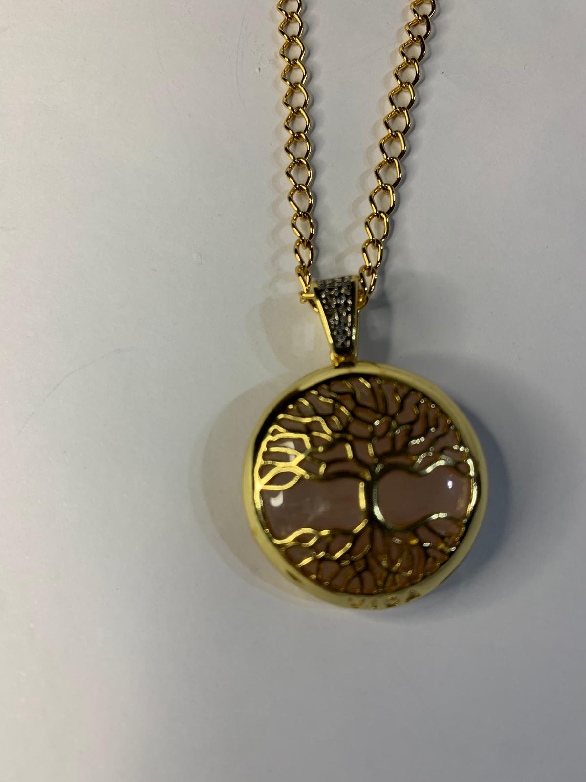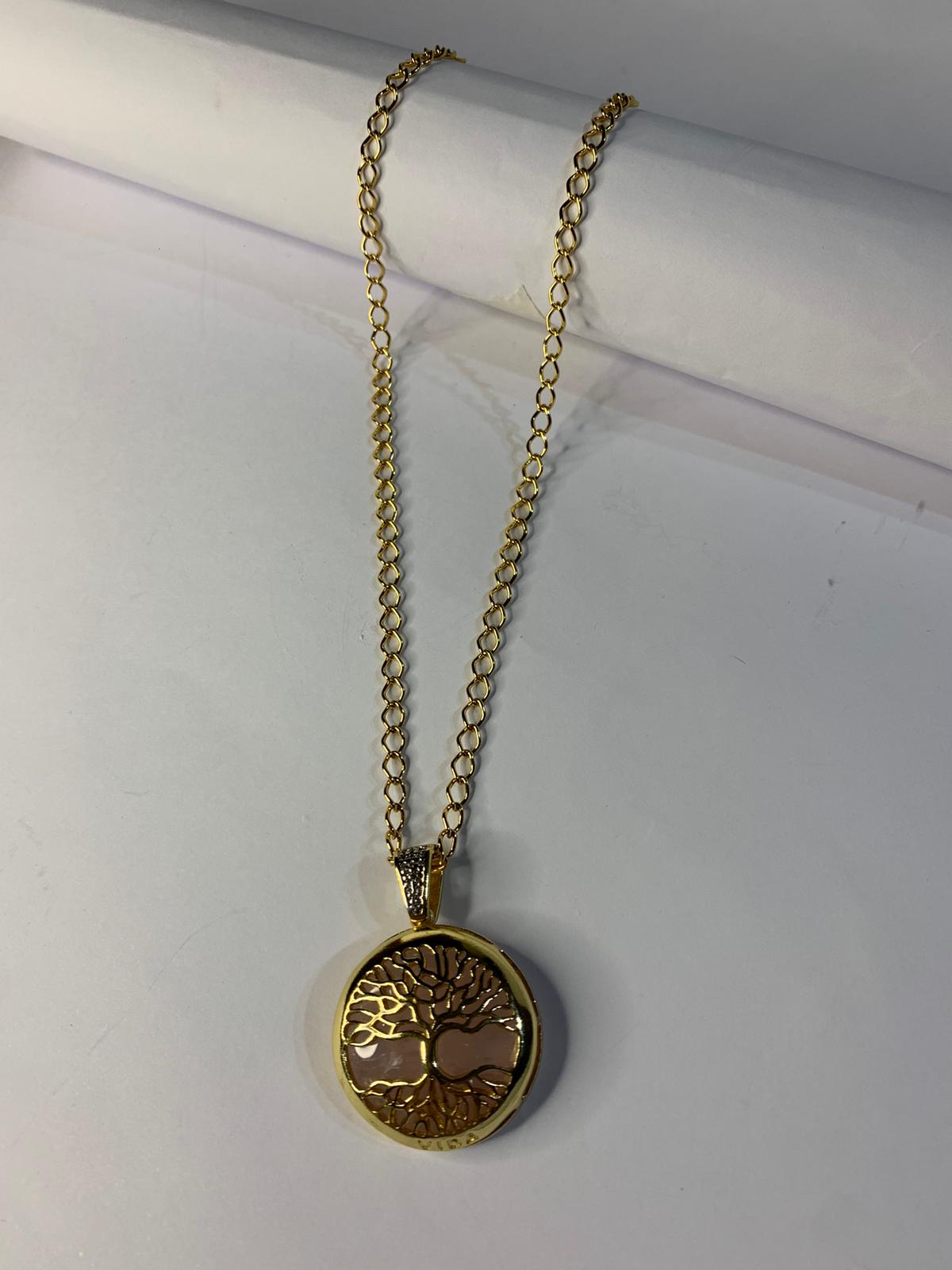 Collar de Árbol de la vida y piedra cuarzo Rosa y baño en oro