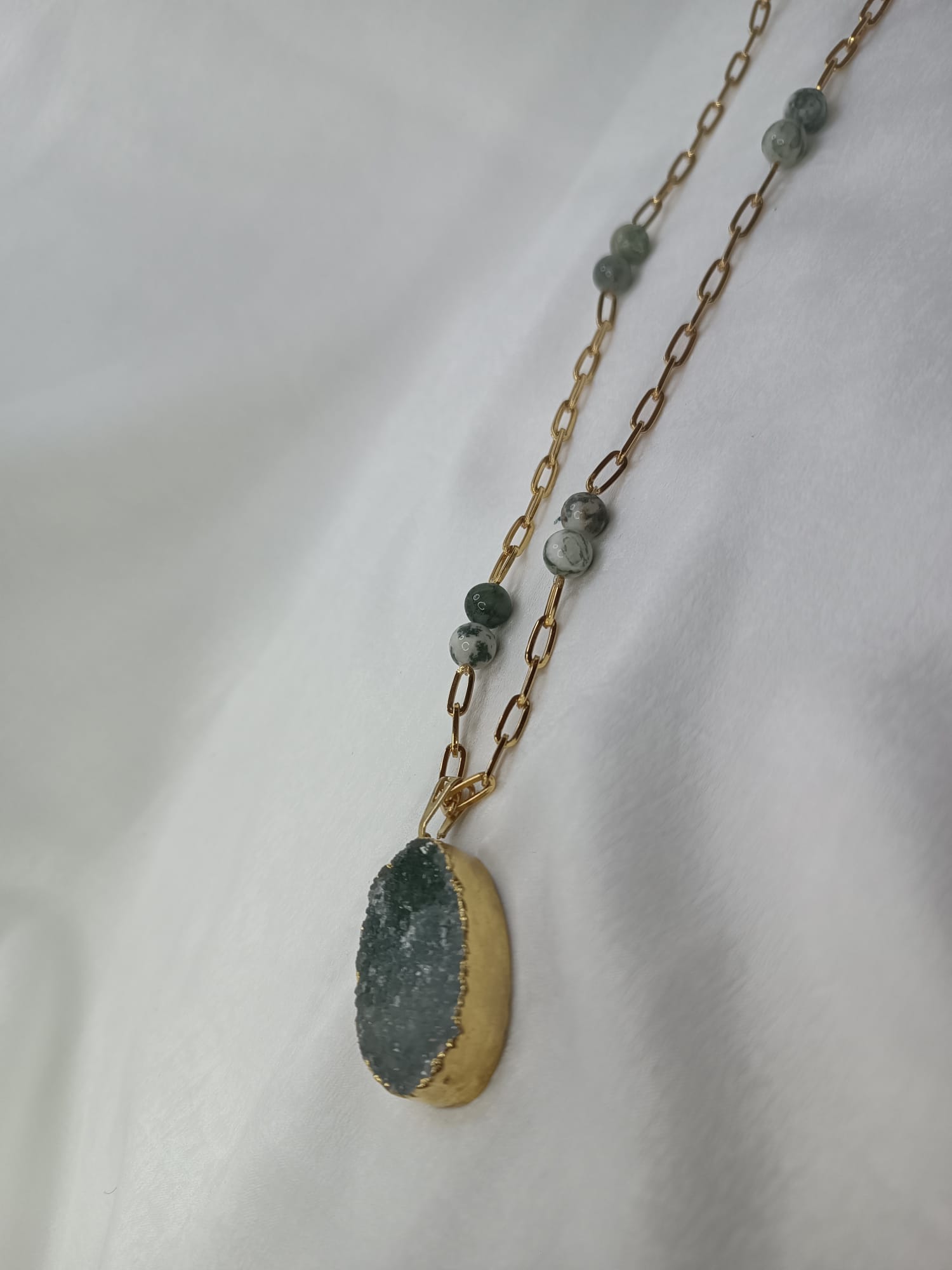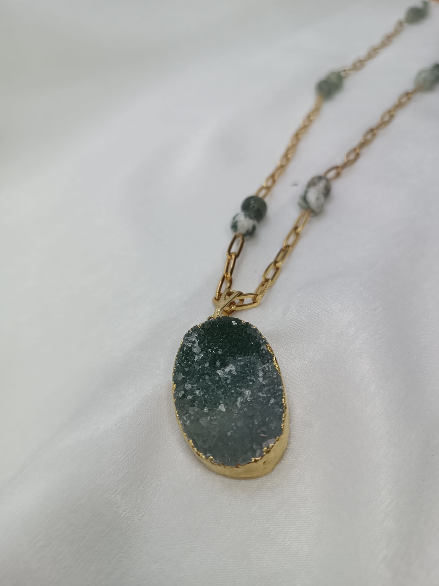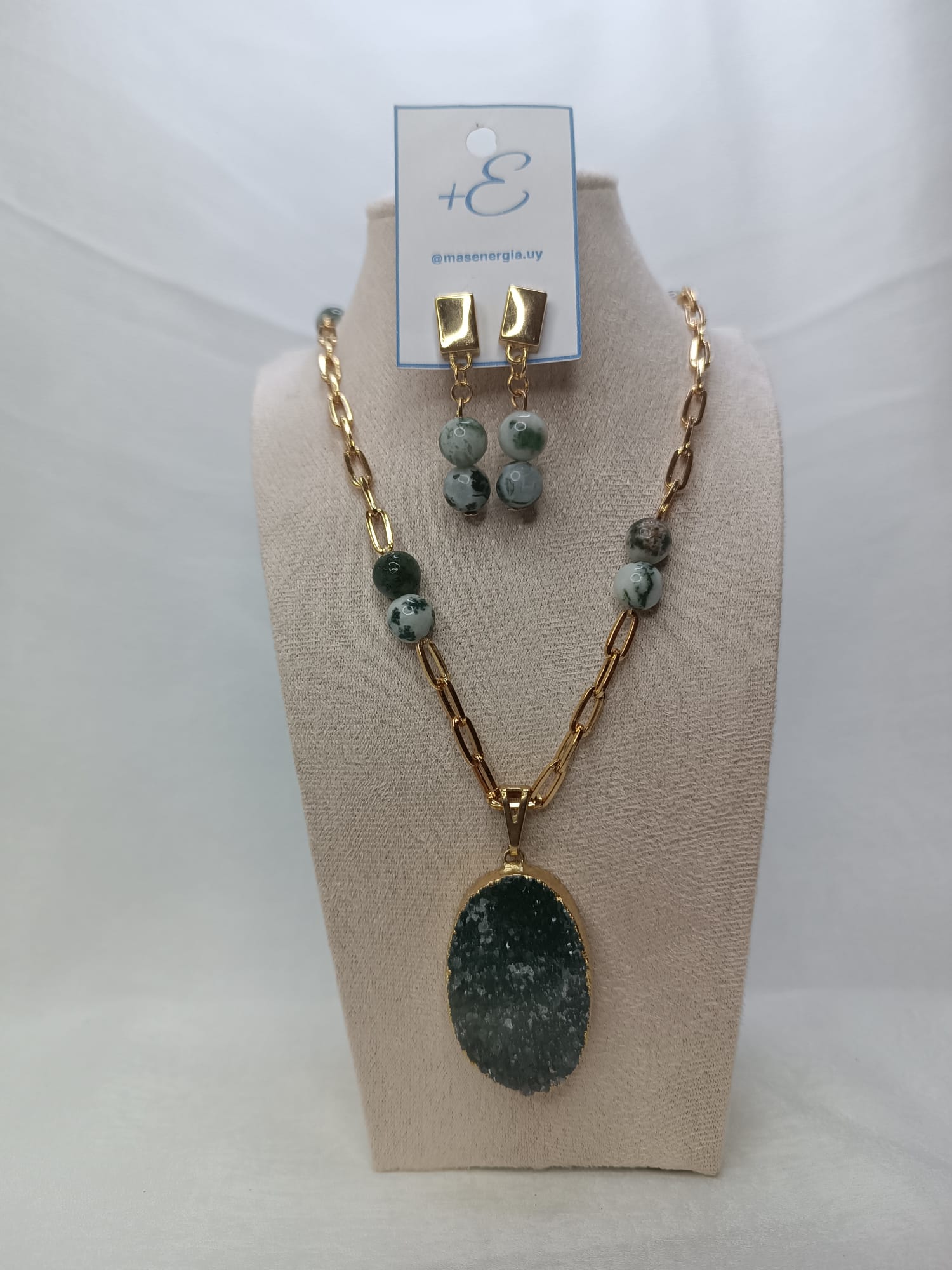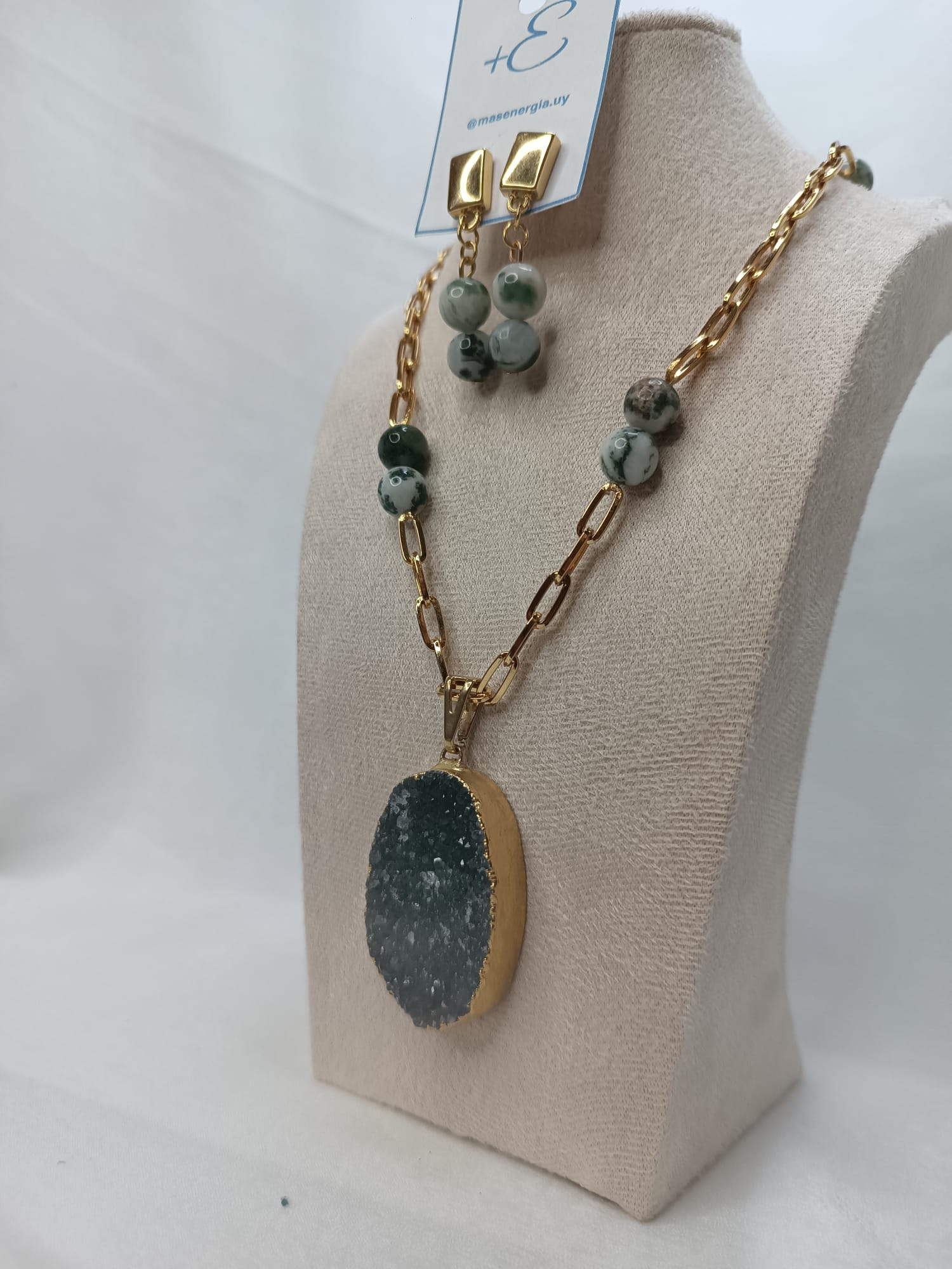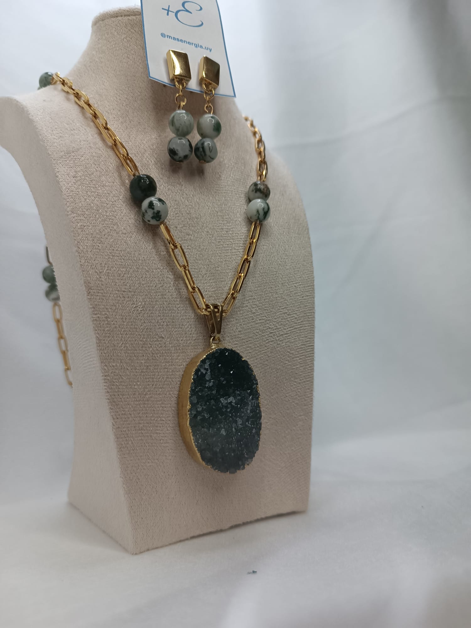 -“Bosque de Luz” combina la serenidad del Ágata Árbol con el encanto brillante del dije druzy. La piedra revela vetas naturales que inspiran calma y conexión con la tierra, mientras que el druzy aporta un destello mágico que ilumina la pieza. El baño en oro envuelve todo con un toque cálido y elegante, creando una joya equilibrada, natural y llena de energía luminosa.🌿✨