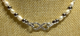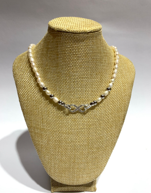 Una joya atemporal que combina la pureza de las perlas de rĂo con la fuerza del infinito en Plata y circonias.