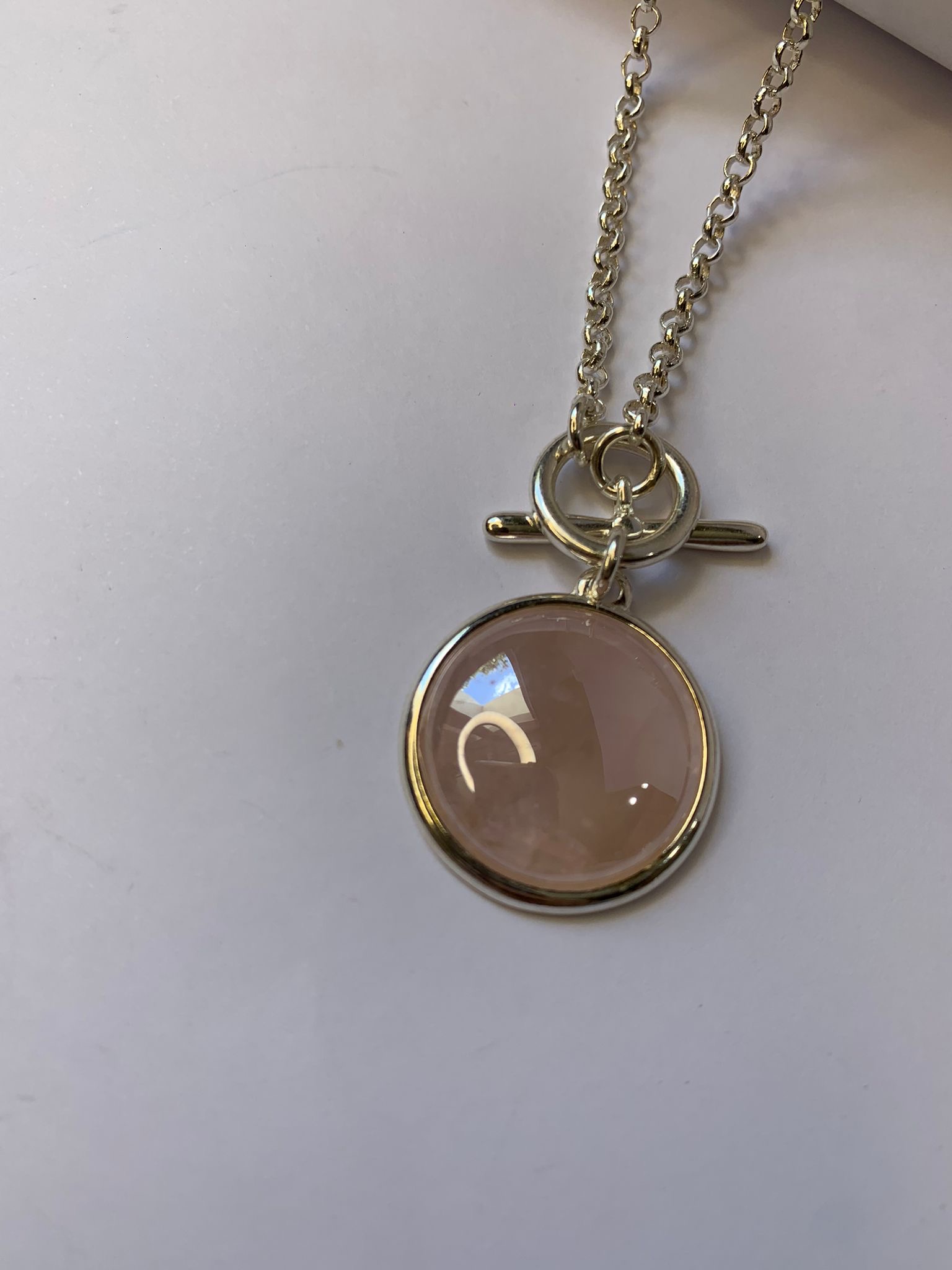 Conjunto de Cadena, dije y caravanas en cuarzo rosa y baño en Plata