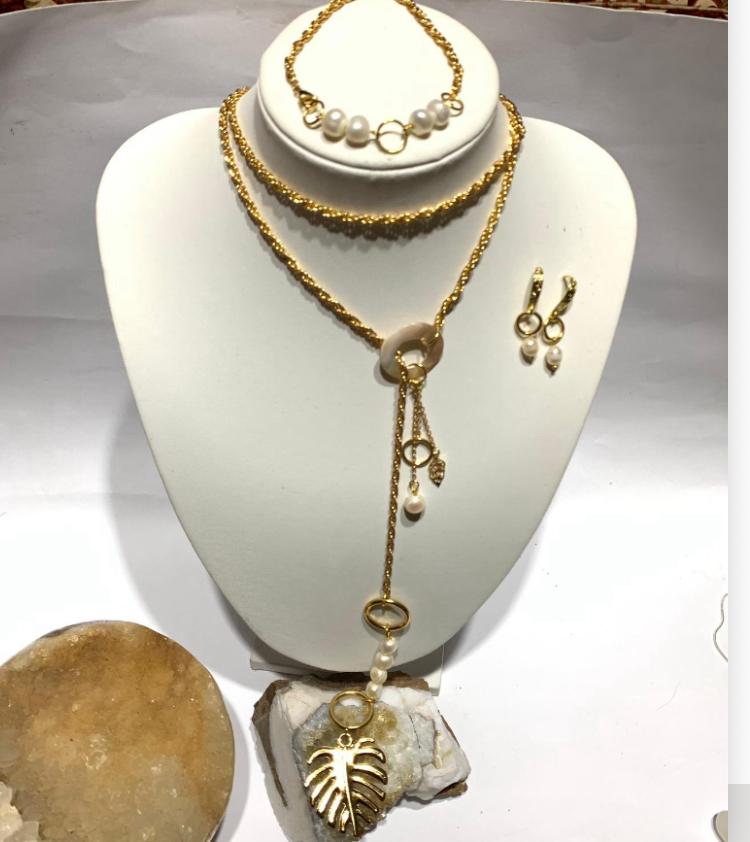 Cadena larga bañada en oro con detalles en perlas de río y nácar, realzada con un dije en forma de hoja que aporta un toque natural y elegante, pulsera y caravana a juego.