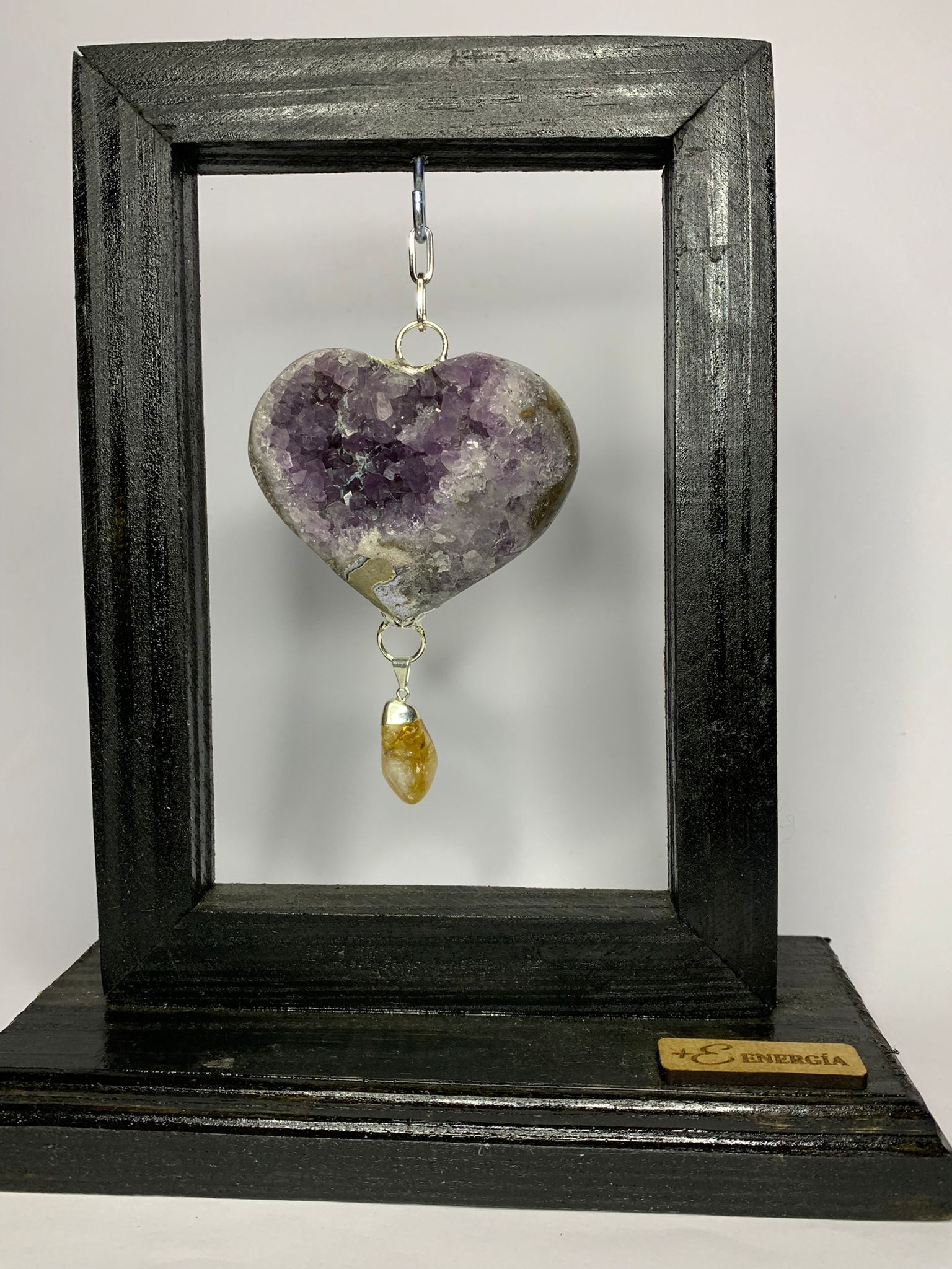 Cuadro decorativo Corazón Amatista, Citrino y madera natural cubierta con pintura negra Altura:23cm Ancho:19,5cm Profundidad: 9cm