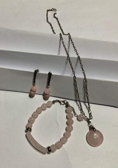 Conjunto en cuarzo rosa y acero laqueado: Caravana, Pulsera y Collar