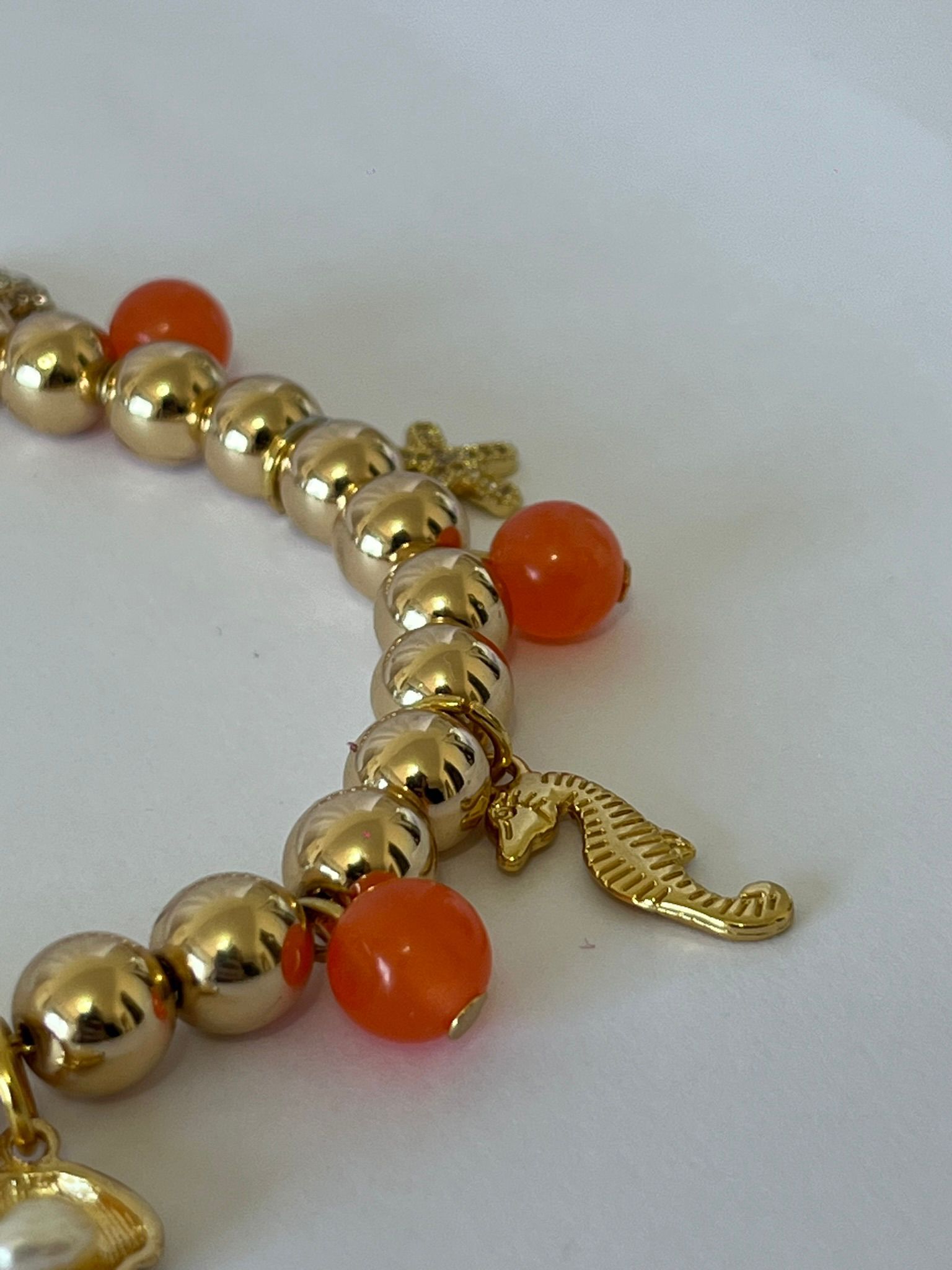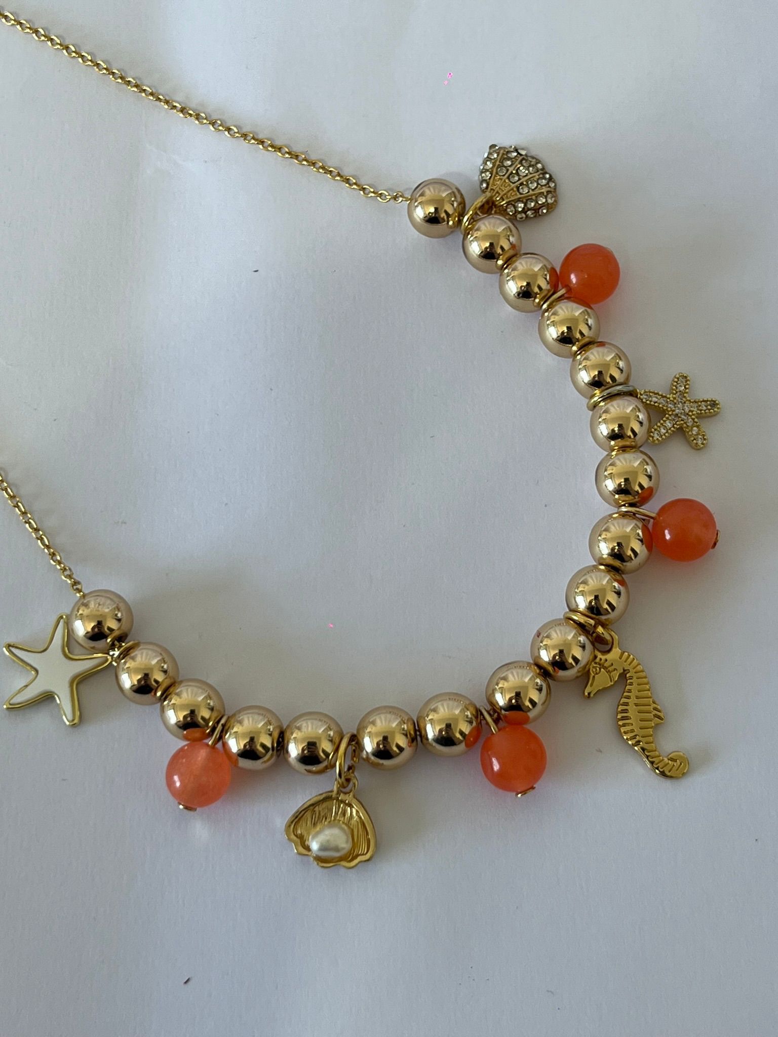-Este collar combina el brillo del baño en oro con piedras naturales de cornalina y delicados dijes marinos —estrella, caballito de mar y concha que evocan libertad, armonĂ­a y energĂ­a positiva.✨