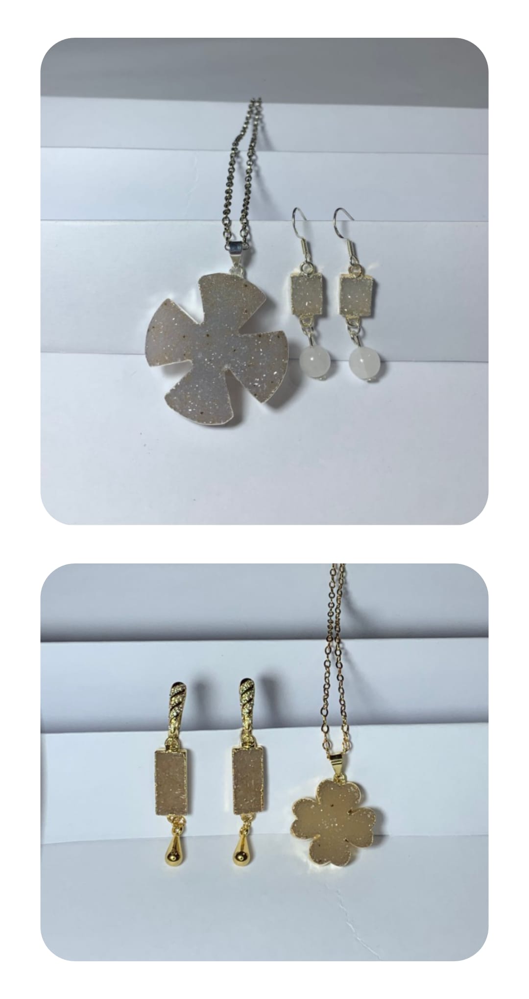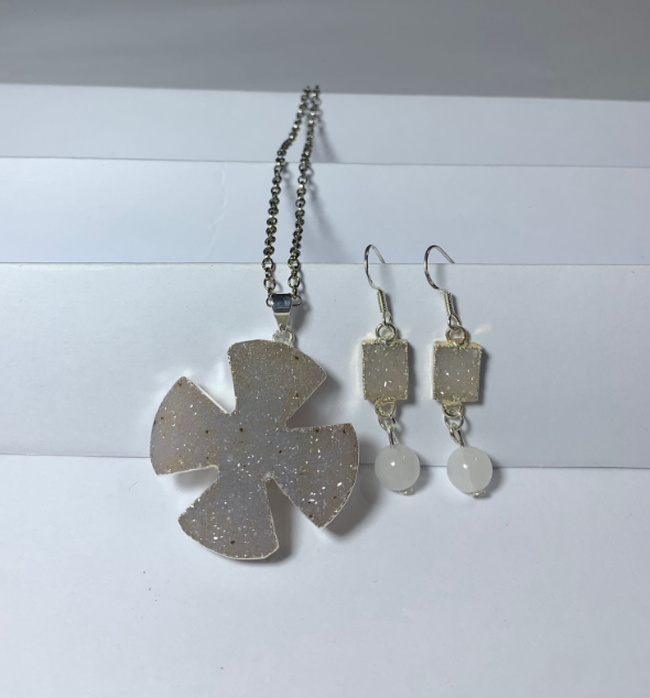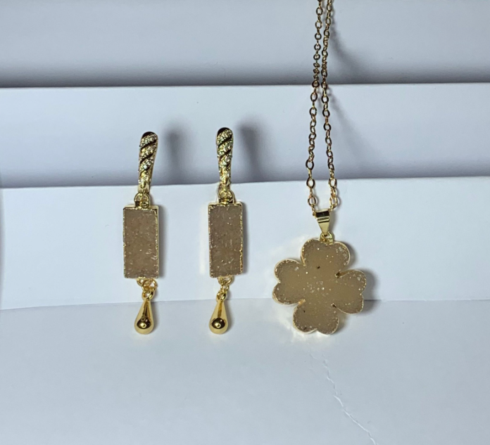 Cadena y dije en acero laqueado, baño en oro y piedra Druzy: Collar y Caravanas